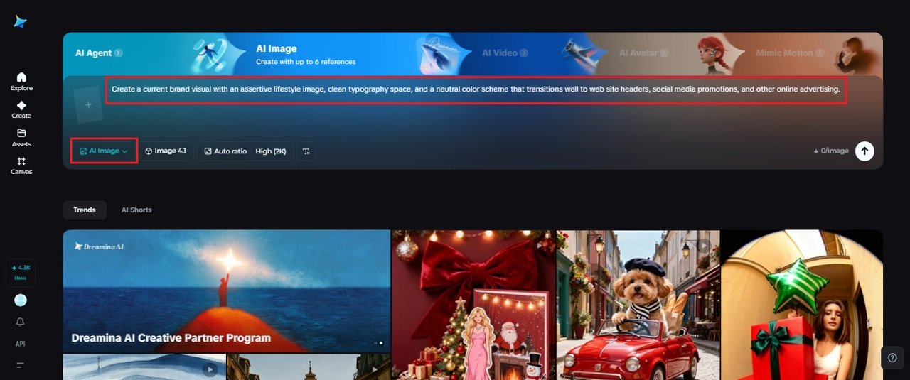 Click on the Dreamina tool and start by composing an elaborate description of the overall concept of the image you want to convey. For instance, the subject, mood, brand tone, and feel on platforms.