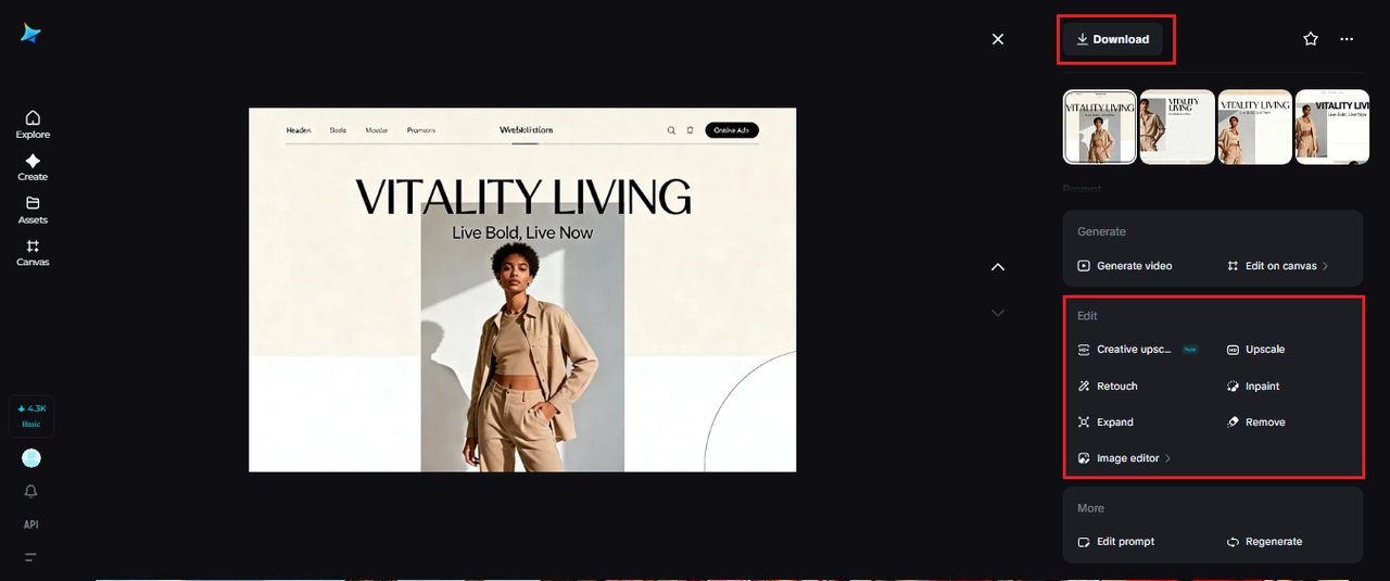 Step Use Dreamina’s tools to fine-tune each version. Stretch the canvas to enlarge banner graphics, inpaint to reformat text boxes, eliminate distractions in photos, or touch up details. When each format looks just right, click the “Download” icon to save visuals designed specifically for the web, social, or advertising.