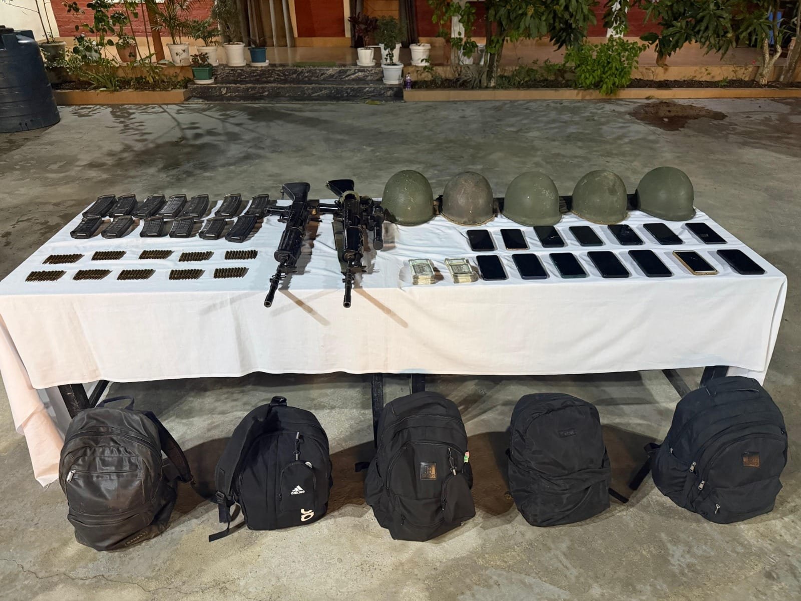During the operation, police recovered two INSAS rifles, eight INSAS light machine gun magazines, five INSAS rifle magazines, and 100 rounds of INSAS ammunition. Additionally, ₹1 lakh in cash, 12 mobile phones, five helmets, five backpacks, and four four-wheeler vehicles were seized.