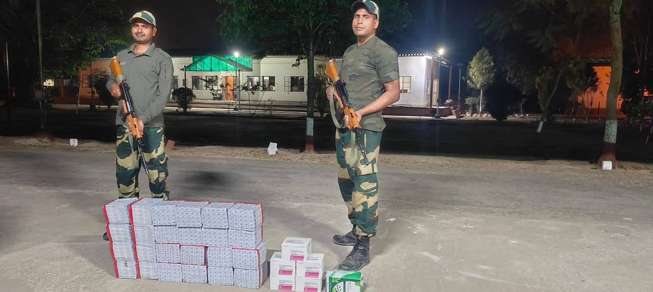 BSF personnel confiscated ganja, Phensedyl, Eskuff, basmati rice, cigarettes, and mobile displays valued at ₹48,55,236. In another operation, they rescued cattle and seized contraband, including ganja, Phensedyl, liquor, and other smuggled goods worth ₹5,85,512.