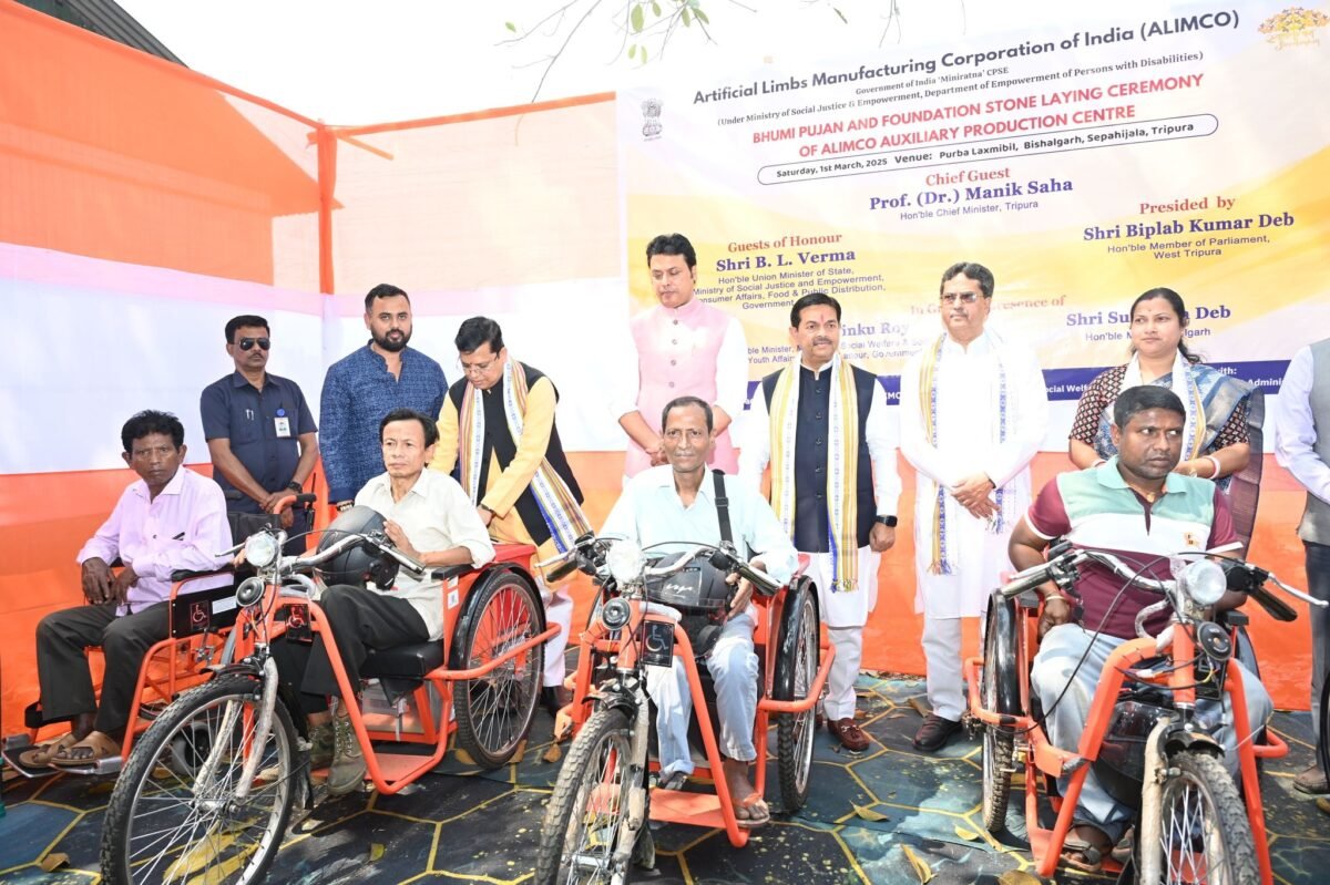 Agartala, March 01, 2025: Tripura Chief Minister Dr. Manik Saha and Union Minister of State for Social Justice and Empowerment B.L Verma on Saturday laid the foundation stone for the ALIMCO’s Auxiliary Production Centre at Purba Laxmibill in Sepahijala district of the state.