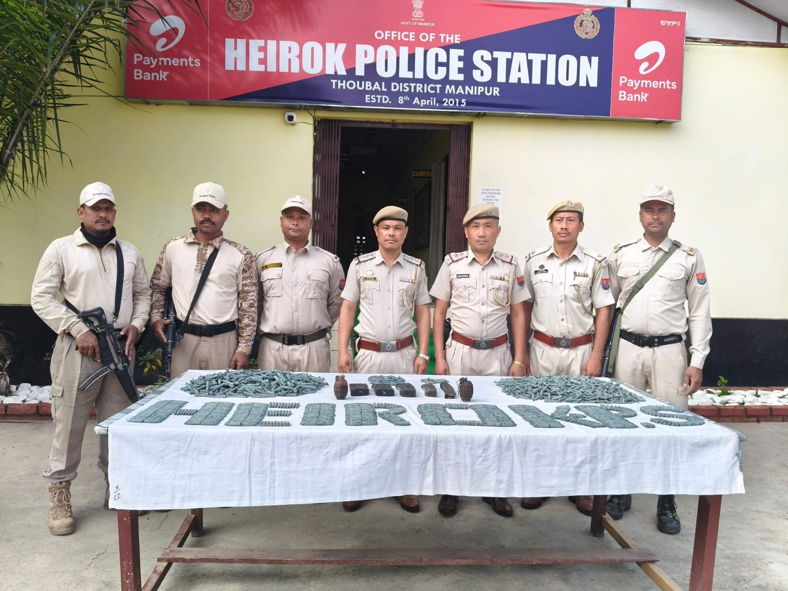 The recovery was made from the Khangabok Mahadeva Ching area, where personnel seized two hand grenades, five magazines of different firearms, and 2,388 rounds of ammunition of various calibres.