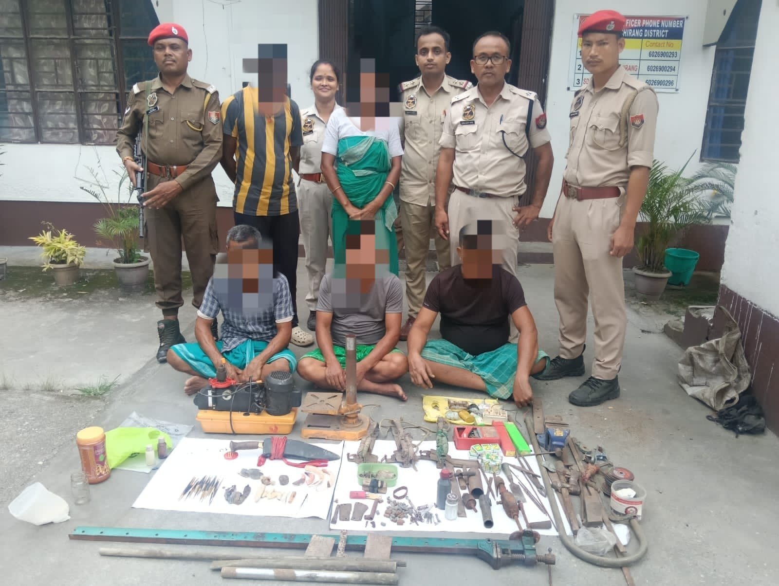 In a joint operation, officials from Bijni Police Station and Manas National Park arrested four individuals suspected of involvement in wildlife poaching. The raid led to the recovery of several illegal items including three iron animal traps, four large wild boar teeth, wild animal bones, six wild animal teeth, a dried tiger tongue and tiger hair, twenty porcupine thorns, along with pistol grips and iron pipes.