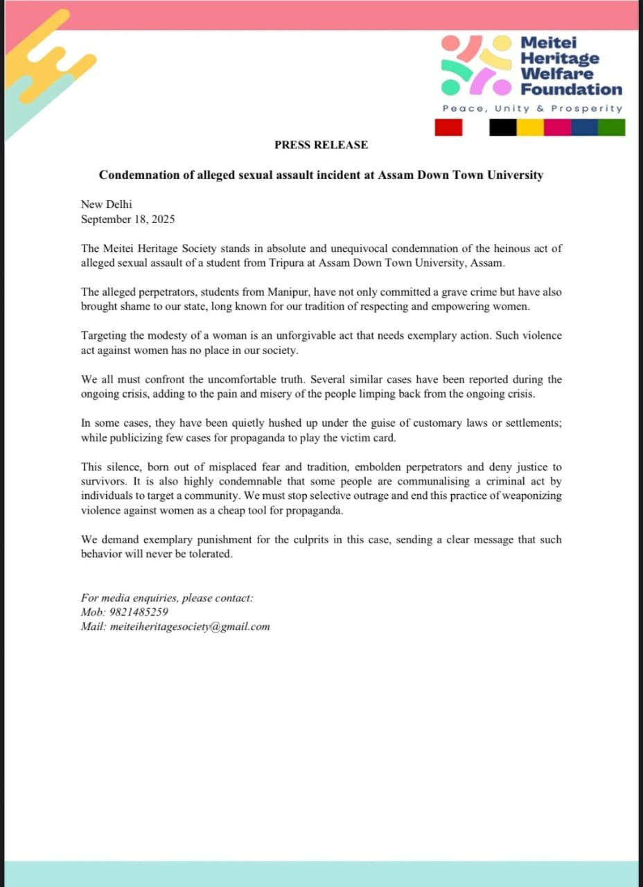 The Meitei Heritage Society has strongly condemned the alleged sexual assault of a student from Tripura at Assam Down Town University, describing it as a heinous crime that demands immediate and exemplary punishment.