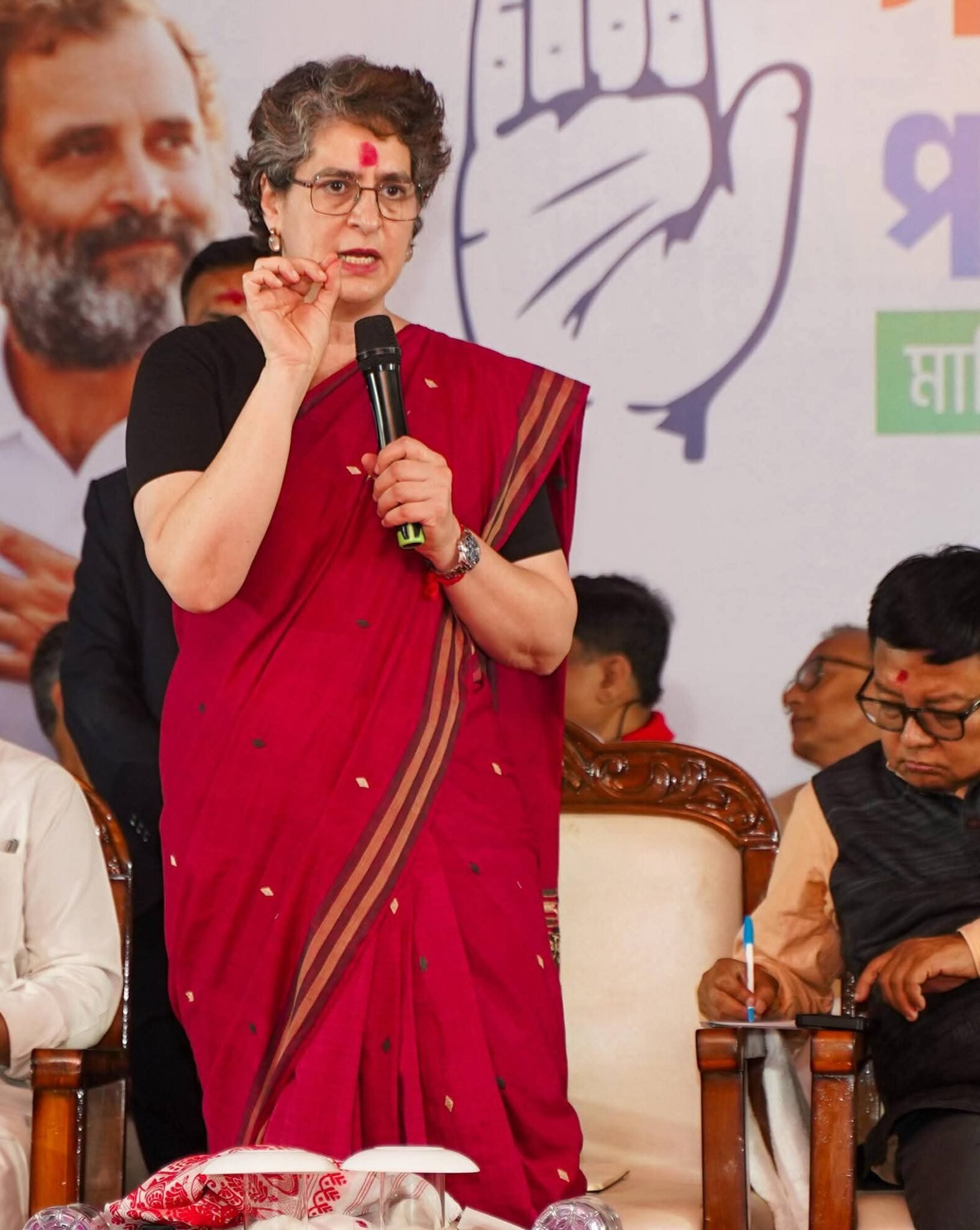 Nazira, April 1: Congress leader Priyanka Gandhi Vadra on Wednesday criticized Assam Chief Minister Himanta Biswa Sarma and the state government during an election rally in Nazira, where she campaigned for Leader of the Opposition and Congress candidate Debabrata Saikia.