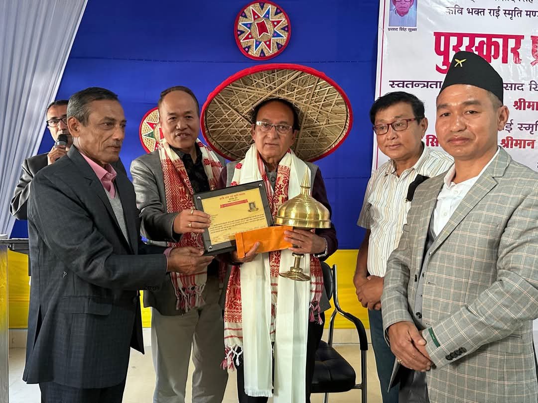 The prestigious award, presented by the Prasad Singh Subba Memorial Academy, Assam, in collaboration with the Kavi Bhakta Rai Smriti Mandap, Siliguri, was conferred during a ceremony at Viswanath College, Assam.