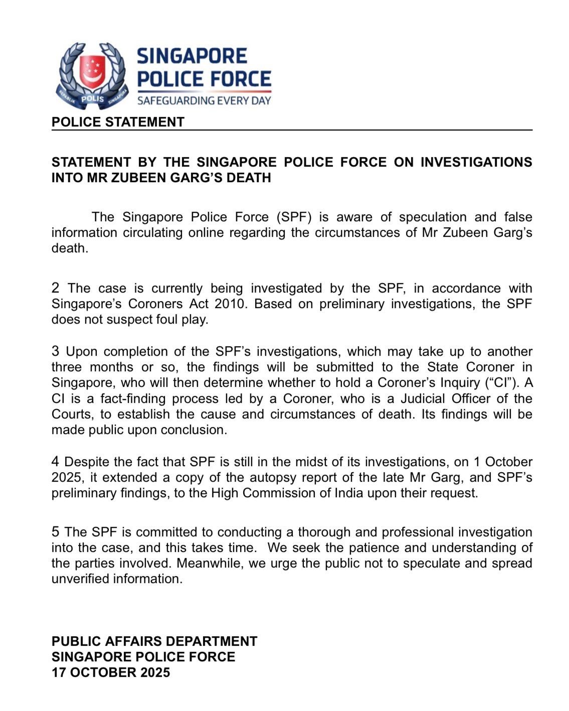 Garg passed away in Singapore on September 19, reportedly while swimming, a day before he was scheduled to perform at the Northeast India Festival. The SPF urged the public to refrain from spreading unverified information amid speculation surrounding the circumstances of his death.