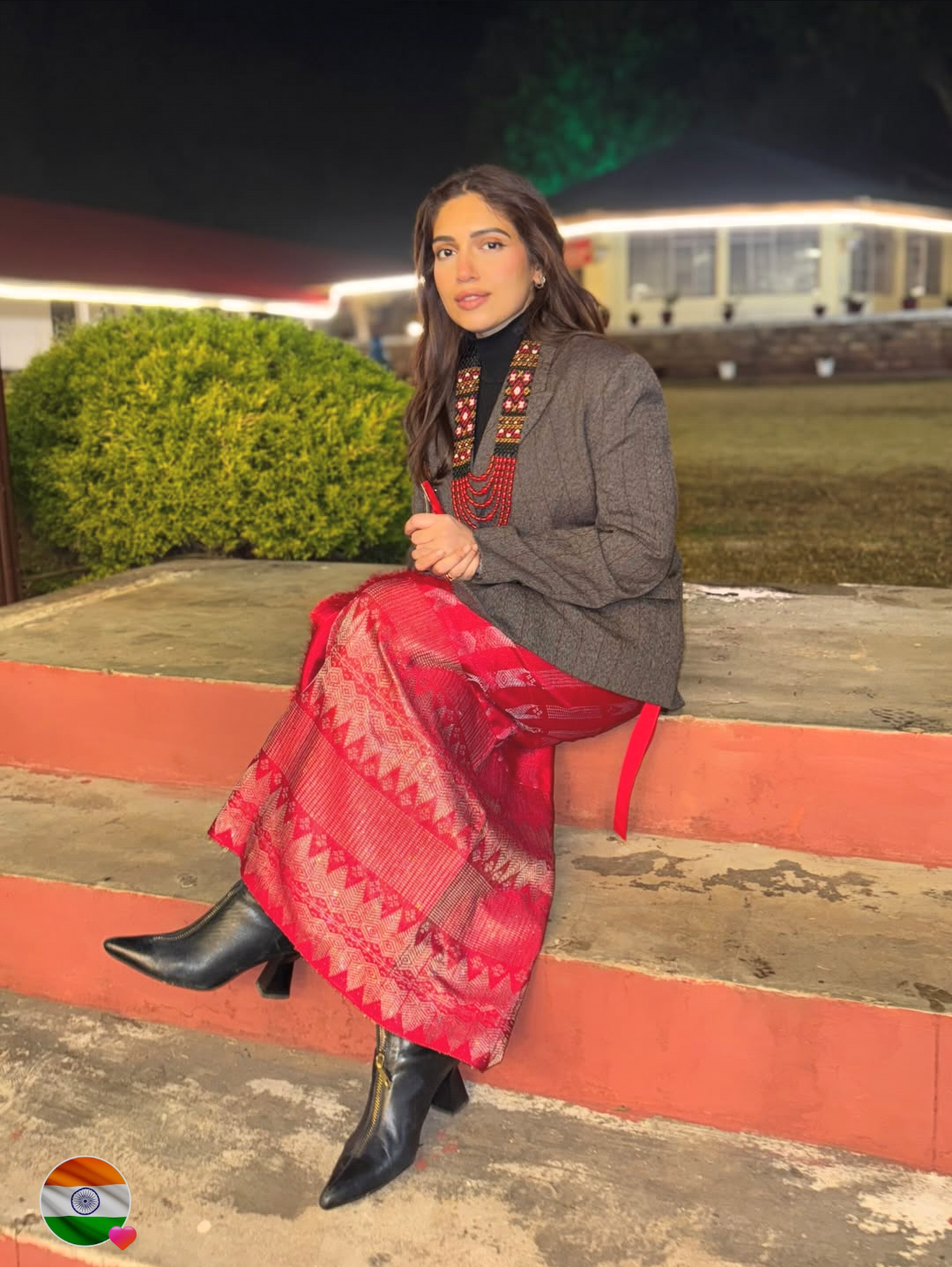 The 36-year-old actor spent three days with officers and jawans training Agniveers. On January 27, she shared images on Instagram of her outfit a black high-neck top with a grey full-sleeved blazer featuring double collars, notch lapels, and side pockets, paired with a red silk Assamese wrap skirt with intricate handwoven golden embroidery.