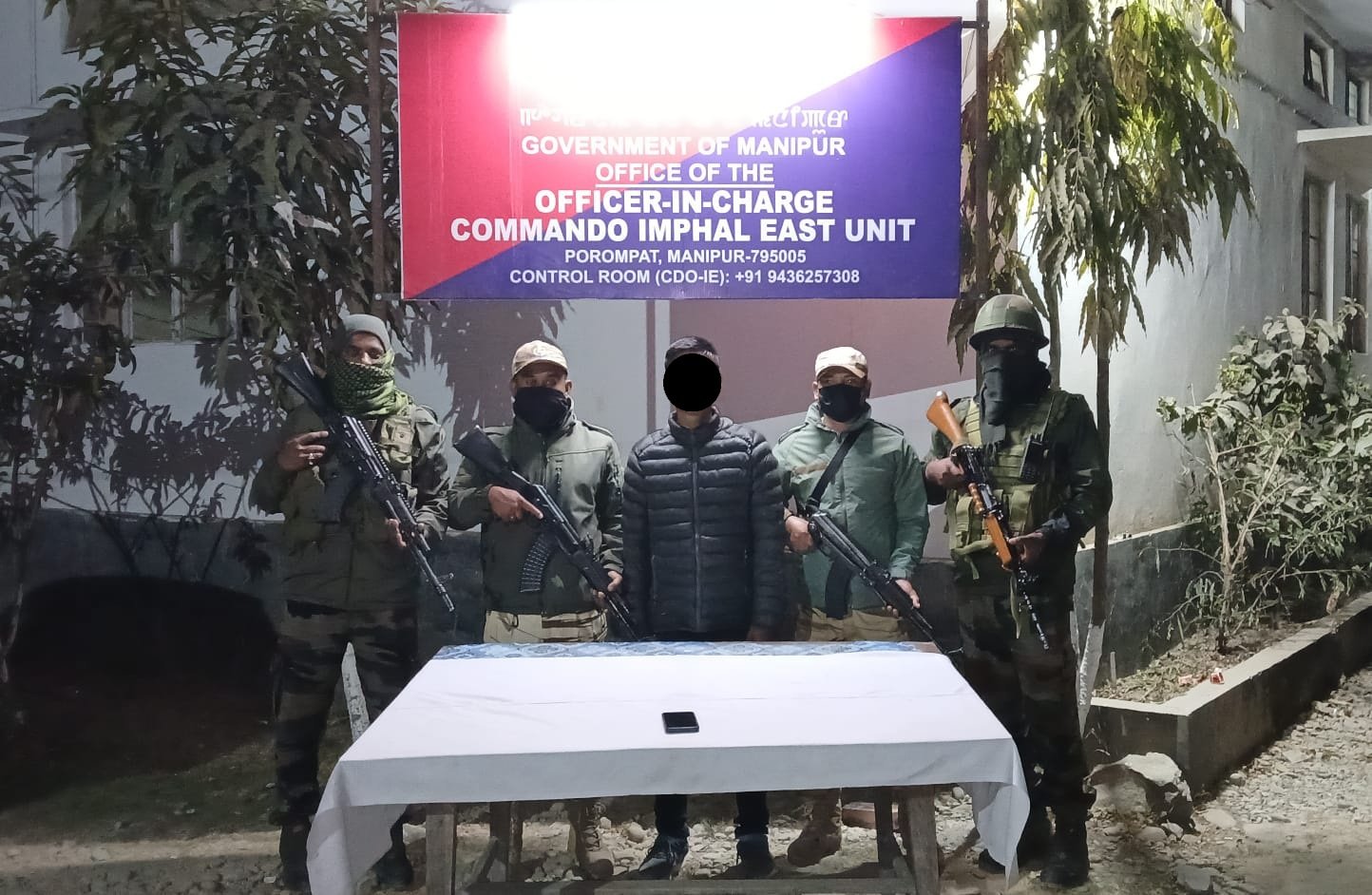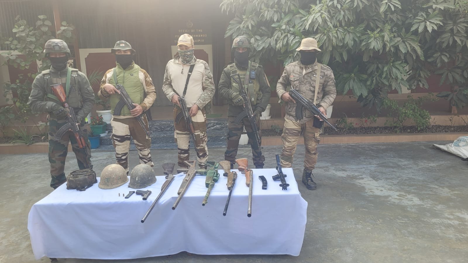 In a separate operation the same day, security forces recovered a substantial cache of arms and ammunition from Tentha Erel Ching under Khongjom Police Station in Thoubal district. The recovered items included one SMG carbine with a magazine, three bolt-action rifles, two single-barrel breech-loading (SBBL) guns, one .32 pistol with magazine, one .32 live round, one 9 mm blank cartridge, and three helmets.