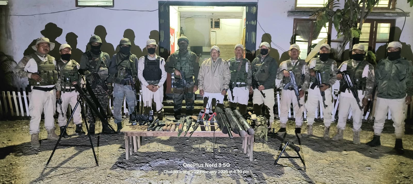 A day earlier, on February 22, a search operation was conducted in the general area between T. Bollok and L. Molhoi villages under Chakpikarong Police Station in Chandel district. The operation led to the recovery of a wide array of firearms and communication devices, including one G-3 rifle with an empty magazine, three country-made Lathode guns, two single-barrel guns, three locally made Pompi shells, four Pompi guns, two locally made carbines with empty magazines, two magazine pouches, 55 rounds of 7.62 mm live ammunition for AK rifles, eight Baofeng radio sets and one dagger with cover.