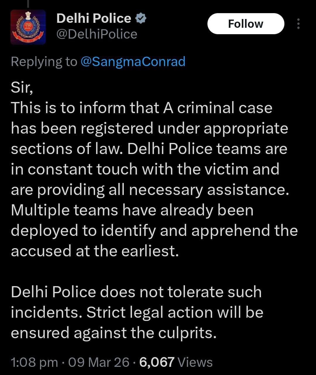 In a post on X, Delhi Police stated that a criminal case has been registered and multiple teams have been deployed to identify and apprehend those involved. Police said they are in contact with the victim and are providing necessary assistance while the investigation continues.