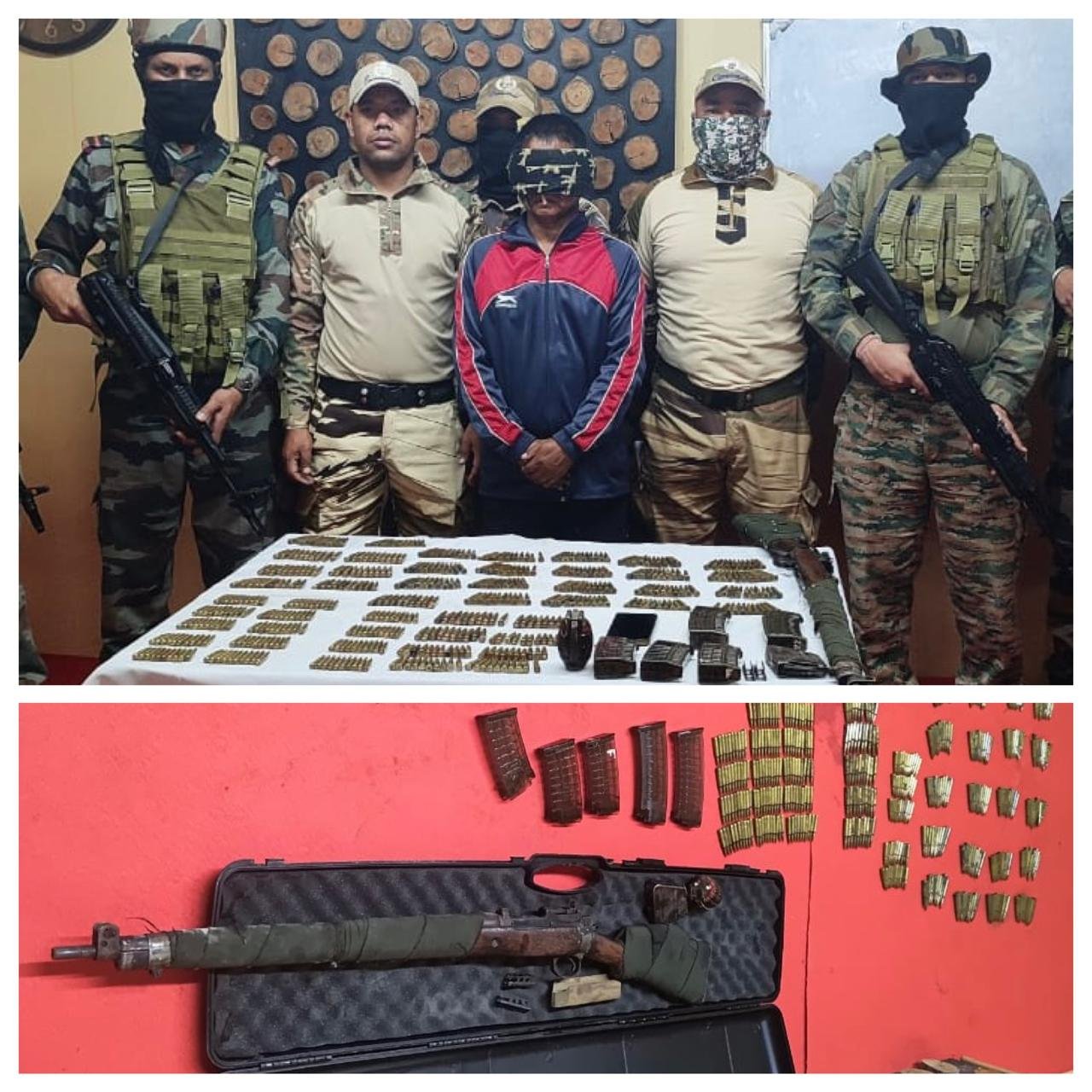 Police said on Monday that an active cadre of the banned United National Liberation Front (Pambei), identified as Thoudam Bobby Singh (50), was apprehended on Saturday from Toubul Mayai Leikai in Bishnupur district. He was found carrying a .303 rifle with magazines, five additional magazines of different rifles, one hand grenade, 501 live rounds of various calibres, and other incriminating items.