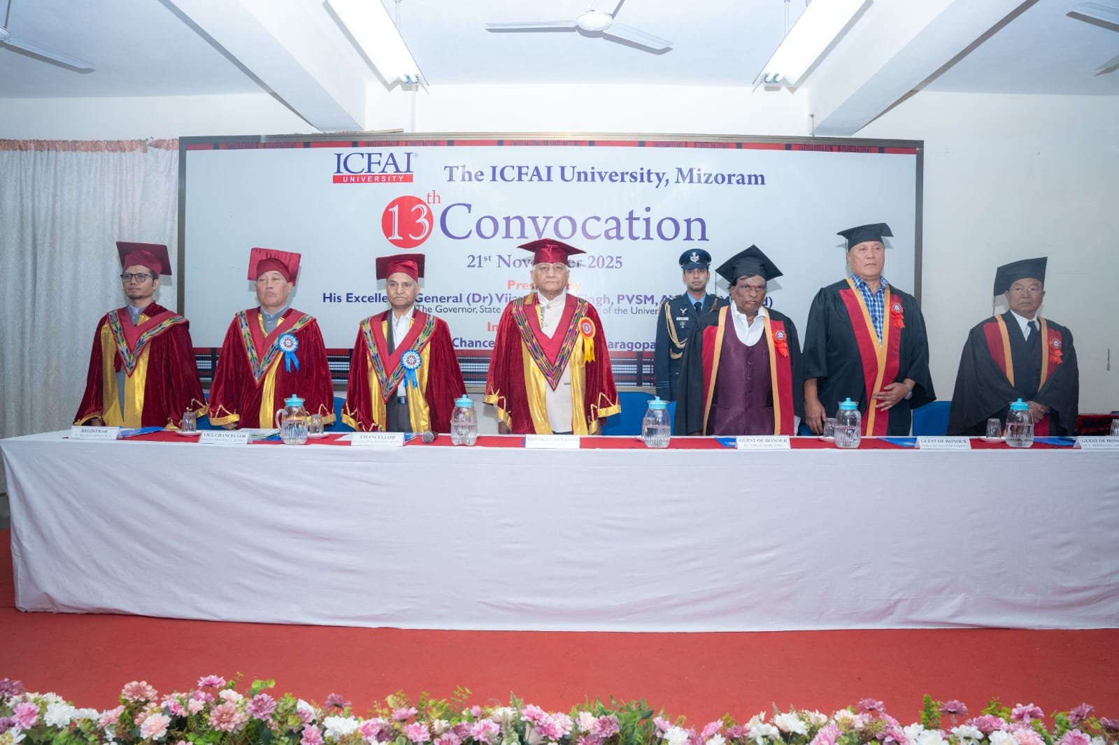 Aizawl, Nov 21: Mizoram Governor General (Dr) Vijay Kumar Singh, PVSM, AVSM, YSM (Retd), who is also the Visitor of ICFAI University Mizoram, graced the 13th Convocation of the University today at the NJ Yasaswy Memorial Auditorium, Durtlang North, Aizawl. Also present as Guests of Honour were Padma Sangthankima, Dr. C. Dothanga IPS (Retd), and Dr. Anil Kumar Joshi.