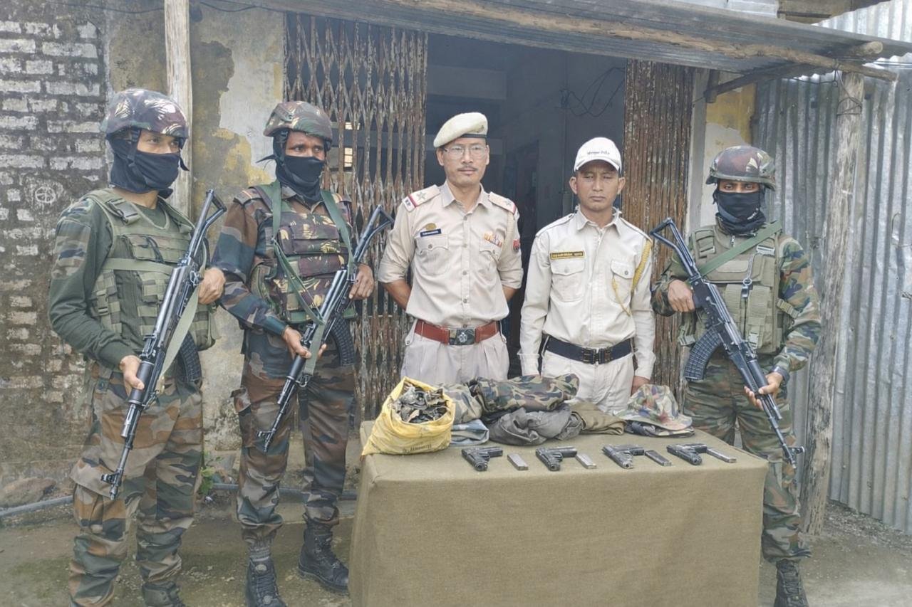 Meanwhile, during a search operation in the forest area of Saivom Ridge under Tengnoupal Police Station in Tengnoupal district, security forces recovered a cache of arms, ammunition and explosives. The items included four 9 mm pistols, four pistol magazines, and 12 improvised explosive devices (IEDs), which were destroyed on the spot.