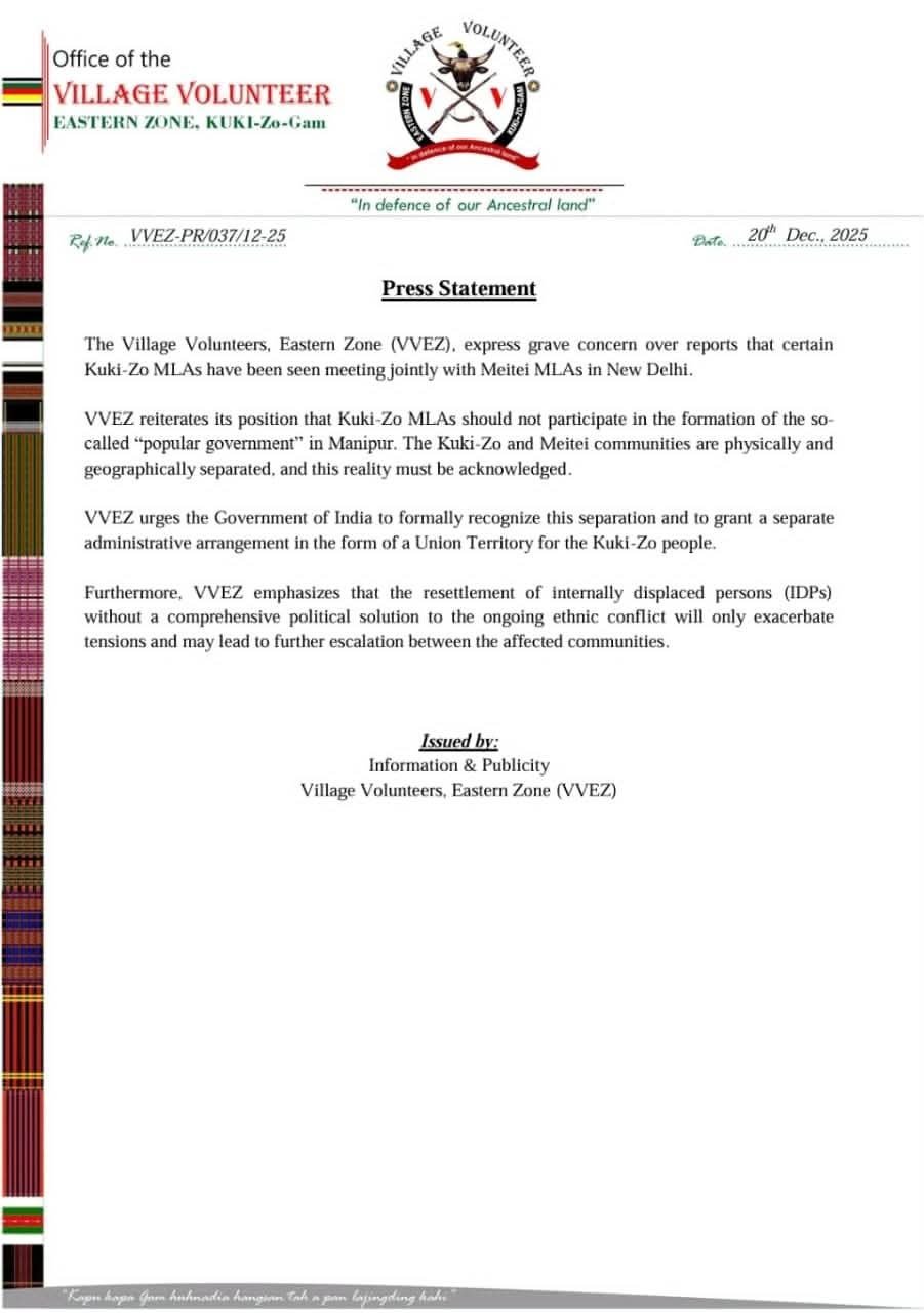 In a statement issued by its Information and Publicity wing, the VVEZ asserted that Kuki-Zo legislators should refrain from participating in the formation of what it termed a “so-called popular government” in Manipur. The group maintained that the Kuki-Zo and Meitei communities are now physically and geographically separated, a reality it said must be formally acknowledged.