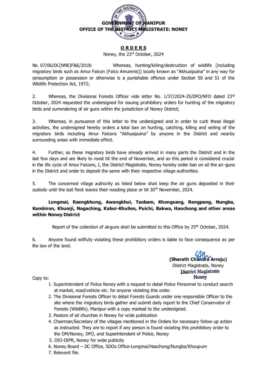 Meanwhile, in neighboring Noney district, District Magistrate Sharath Chandra Arroju has also imposed a total ban on hunting, capturing, or selling the Amur Falcons. Villages in Noney, including Longmai, Rengkhung, and others, have been instructed to deposit airguns, with a deadline set for October 25. Violators face severe penalties under the Wildlife Protection Act, 1972.