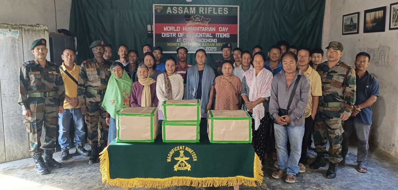 Assam Rifles marked World Humanitarian Day by distributing essential commodities to residents of Haochong village in Noney district, Manipur.