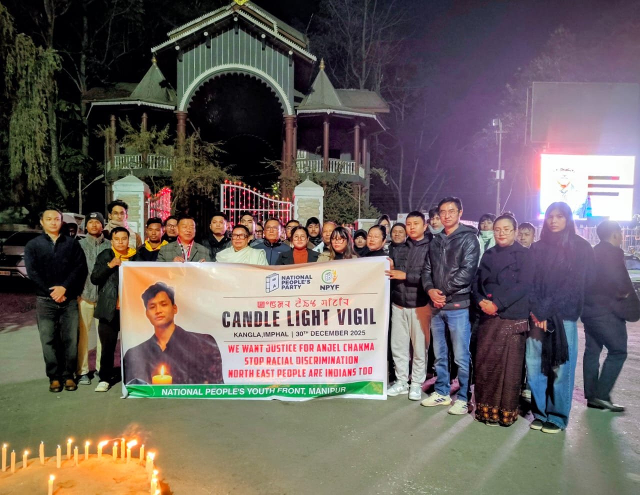 The National People’s Youth Front (NPYF), Manipur, organised a candlelight vigil at Kangla Main Gate, Imphal, demanding justice for Anjel Chakma and condemning racial discrimination faced by people from the Northeast.