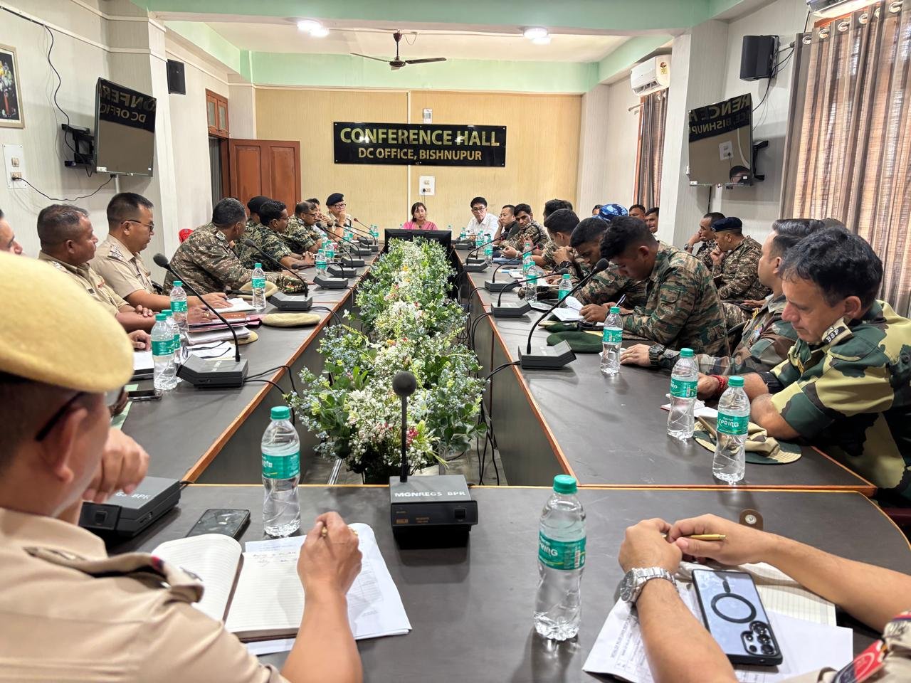 The meeting was attended by key officials including SP (i/c) Th. Shangkar Deba, ADM Toijam Opendro, commanding officers and representatives of central forces, SDOs, OCs, and other concerned officials.
