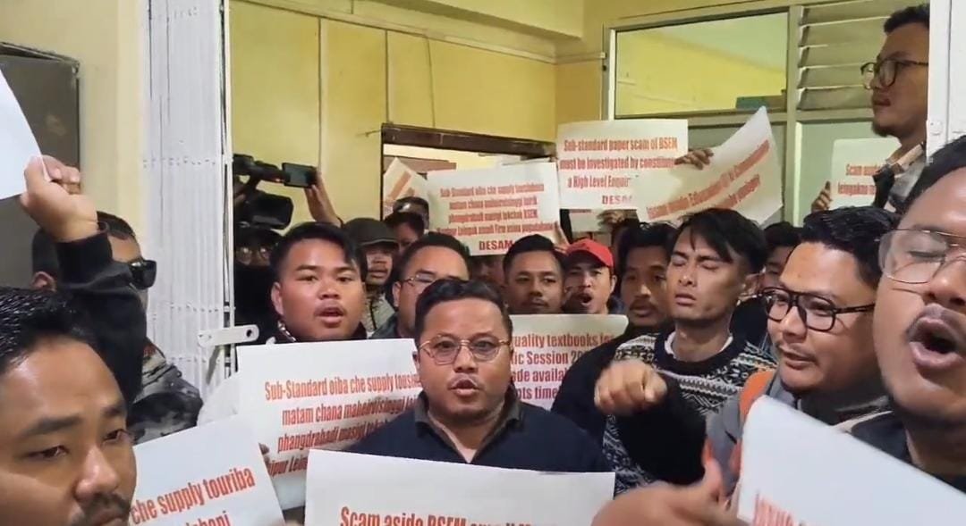 Raising slogans and demanding an inquiry, the protesters entered the BOSEM office, accusing the authorities of compromising students’ academic interests by allowing the use of poor-quality paper. The protest was led by DESAM President M. Somorjit, who said that around noon, volunteers marched into the BOSEM premises to press for timely supply of textbooks, rejection of low-quality paper for printing purposes, blacklisting of the firm responsible for supplying substandard paper, and a thorough inquiry into the alleged scam by the Commissioner of Education (Schools). The protesters also demanded accountability from the BOSEM Chairman and Secretary.