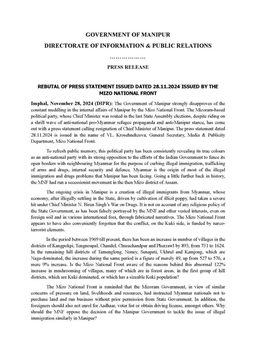 “Why should the MNF oppose the Manipur government’s actions when Mizoram has implemented similar measures?” the statement questioned, urging the MNF to focus on the broader issue of illegal immigration rather than accusing the Manipur government of discrimination.