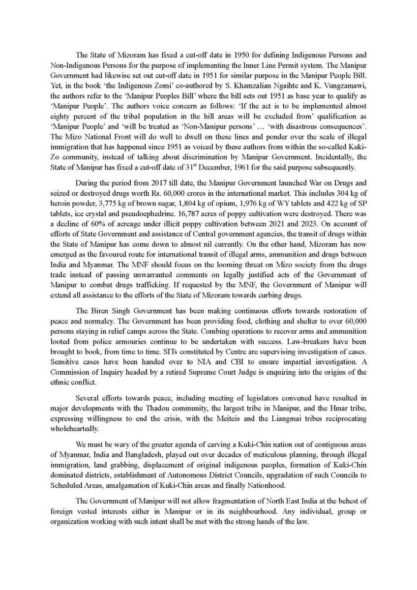 The statement concluded by emphasizing Manipur’s commitment to safeguarding its land, resources, and security in the face of external and internal challenges.