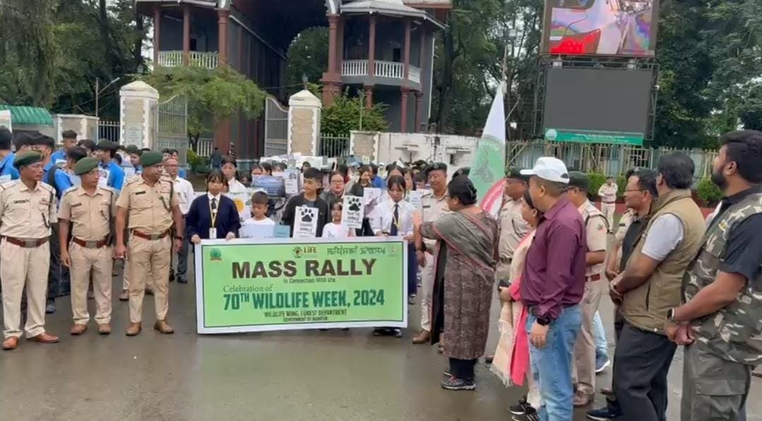 Hundreds of students from various educational institutions gathered today to celebrate the 70th Wildlife Week, organized by the Wildlife Wing of the Forest Department of the Government of Manipur, in collaboration with the Central Forest Division. The event, aimed at raising awareness about wildlife conservation and promoting eco-friendly practices, brought together students who proudly displayed banners and chanted slogans in support of preserving the country’s natural heritage.