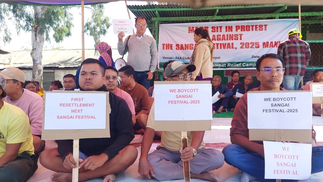 Internally displaced persons (IDPs) taking refuge at Ideal College, Akampat in Imphal East held a silent sit-in protest today, expressing strong resentment over the State Government’s decision to proceed with the Sangai Festival 2025.