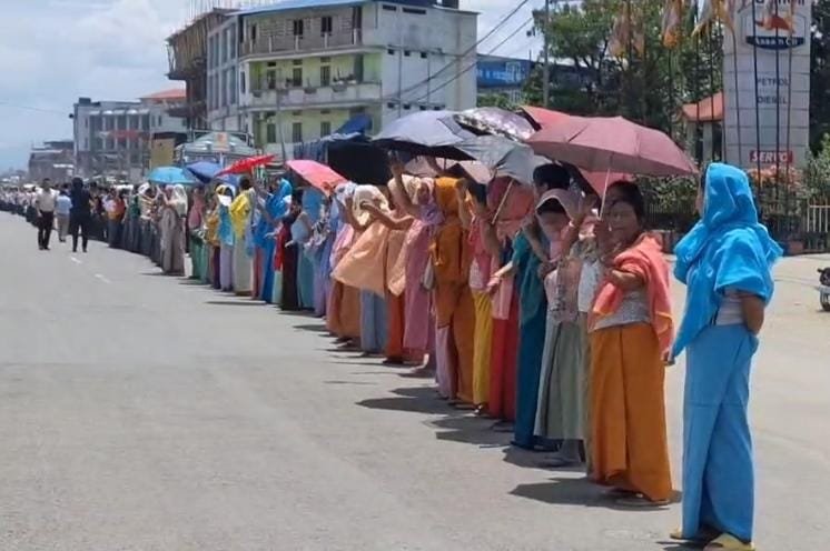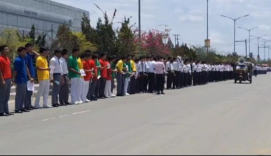 A large-scale human chain protest was organised this morning along the stretch from Kwakeithel to Imphal Airport, led by the All Manipur United Clubs’ Organisation (AMUCO) in coordination with AMAWOVA, Poirei Leimarol, the Manipur Students’ Federation (MSF), and the Centre for Organisation Research and Education (COHR).