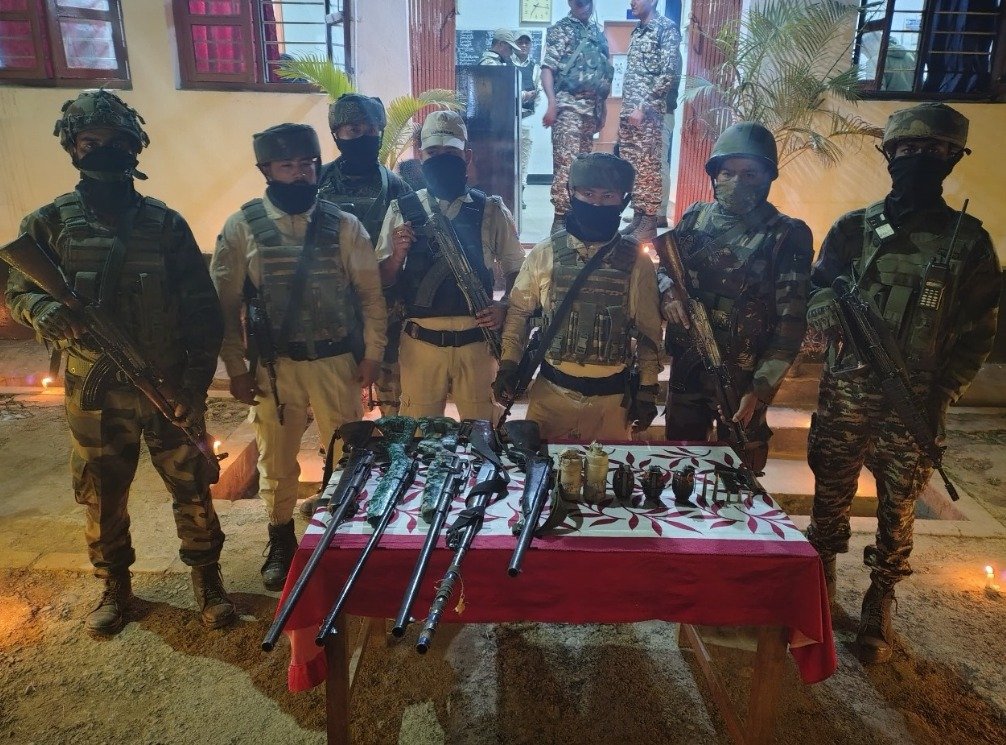 In Sawombung-Paorabi village under Lamlai Police Station in Imphal East, forces recovered one 7.62 mm SLR rifle with a magazine, one Amogh carbine with two magazines, two 9mm pistols, one 9mm pistol with a magazine, 19 rounds of 5.56x30mm Amogh carbine ammunition, five 7.62mm SLR rifle rounds, two 36 HE hand grenades, and one .303 rifle bayonet.