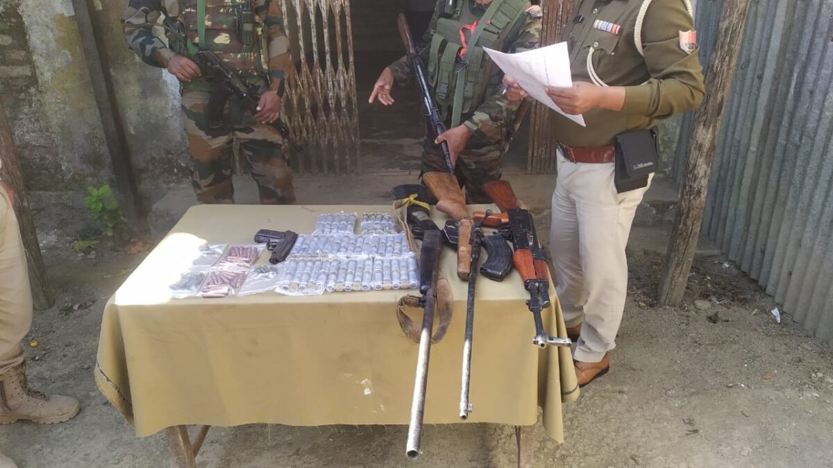 Security forces have recovered a substantial cache of arms and explosives during a search operation at Phougakchao Mamang Leikai, located in the adjoining area of Kolbung near the banks of the Khuga River. The cache included an AK-47 rifle with a magazine loaded with five live rounds, one 2-inch mortar, two SMG carbines with two empty magazines, two country-made 9mm pistols with accompanying magazines, three HE hand grenades (without detonators), two IED explosives, twenty explosive gelatine sticks, and five additional 9mm live rounds.