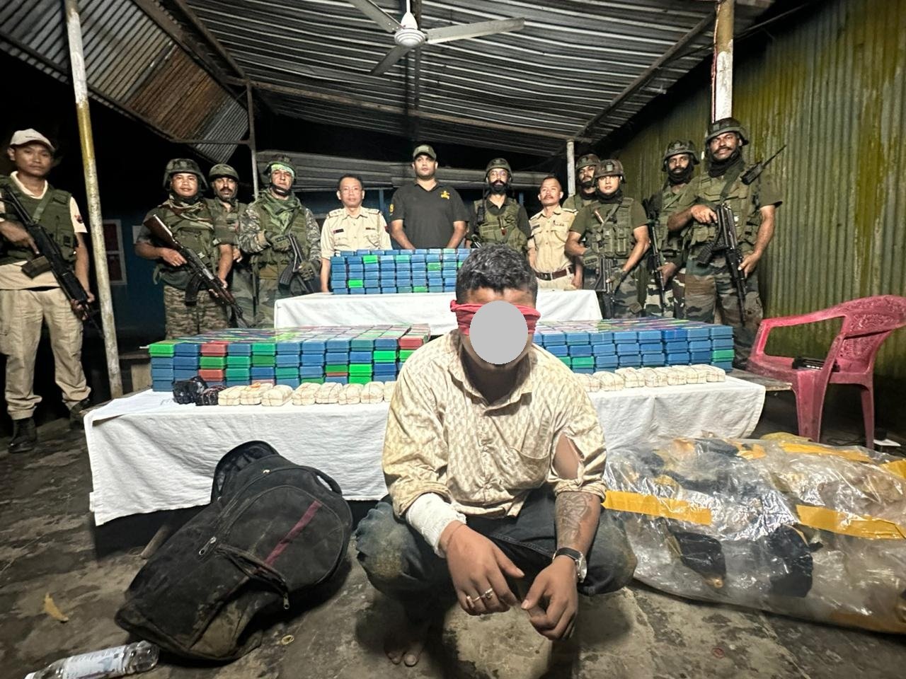 In the first operation, security forces apprehended Mihir Roy, 26, of Kanakpur Part-II, Rangirkhari, Silchar (Assam) during a random frisking and checking drive of passenger engine boats along the Barak River between Savomphai and Chaudharykhal villages under Borobekra Police Station in Jiribam district. From his possession, police recovered three gunny bags containing 616 soap cases suspected to contain brown sugar, weighing approximately 10.096 kg, and five packets containing 250 pouches filled with tablets of suspected narcotic and psychotropic substances, weighing about 5.280 kg.
