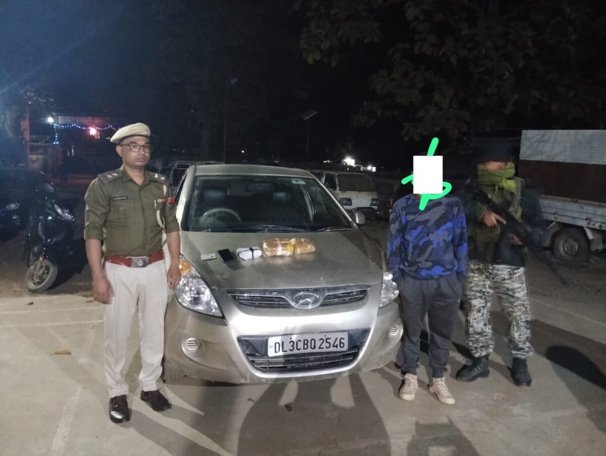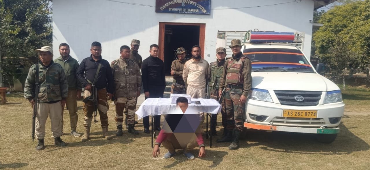 According to a police report, one of the arrested individuals has been identified as Md. Tajuddin (29) of Lilong Litan Makhong. He was apprehended on Thursday near Anita STD High School, Kwakta Pangal Lamkhai, under Phougakchao Ikhai Police Station in Bishnupur district. During the operation, security forces recovered 1,041 grams of brown sugar, a four-wheeler (registration number AS 26C 8774), and a mobile handset from his possession.
