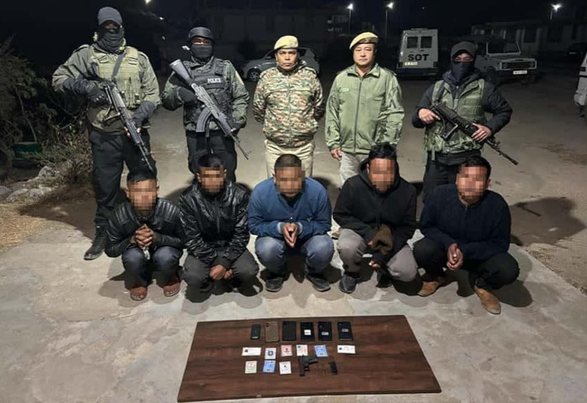 Five individuals were arrested by the special cell/SOT along with Mawsynram police on Sunday after they were found in possession of a Russian-made pistol during a naka checking operation in Mawsynram, East Khasi Hills District.