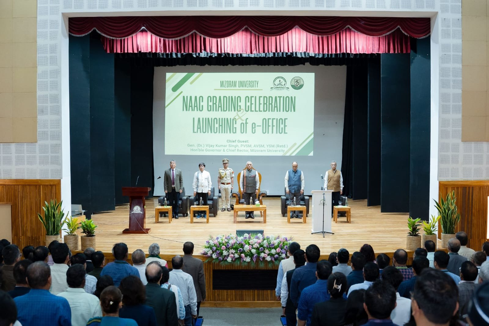 Mizoram Governor, General (Dr) Vijay Kumar Singh, PVSM, AVSM, YSM (Retd), Chief Rector of Mizoram University (MZU), on Tuesday graced a grand ceremony at the MZU Auditorium to celebrate the university’s prestigious A+ Grade (CGPA 3.30) accreditation from the National Assessment and Accreditation Council (NAAC). During the event, the Governor also officially launched MZU’s e-Office Portal, marking a significant milestone in the university’s journey toward digital transformation.