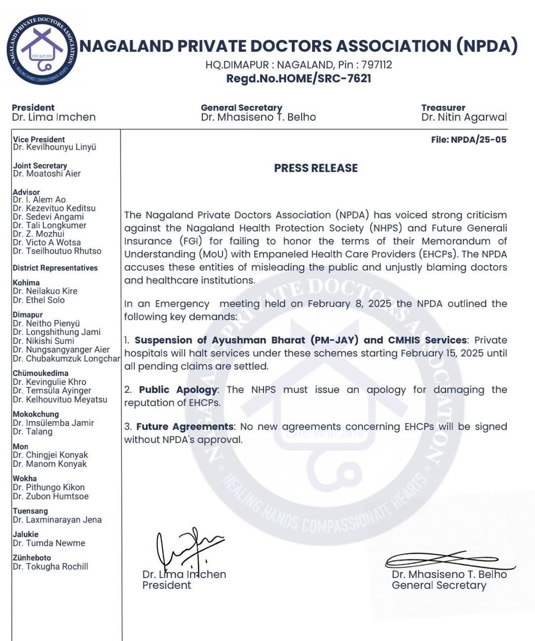 The NPDA has expressed strong dissatisfaction with the Nagaland Health Protection Society (NHPS) and Future General Insurance (FGI), accusing them of failing to honor the terms of their agreements with Empanelled Health Care Providers (EHCPs). The association also criticized these bodies for misleading the public and placing blame on healthcare providers. Additionally, the NPDA has demanded an apology from NHPS for allegedly damaging the reputation of EHCPs.