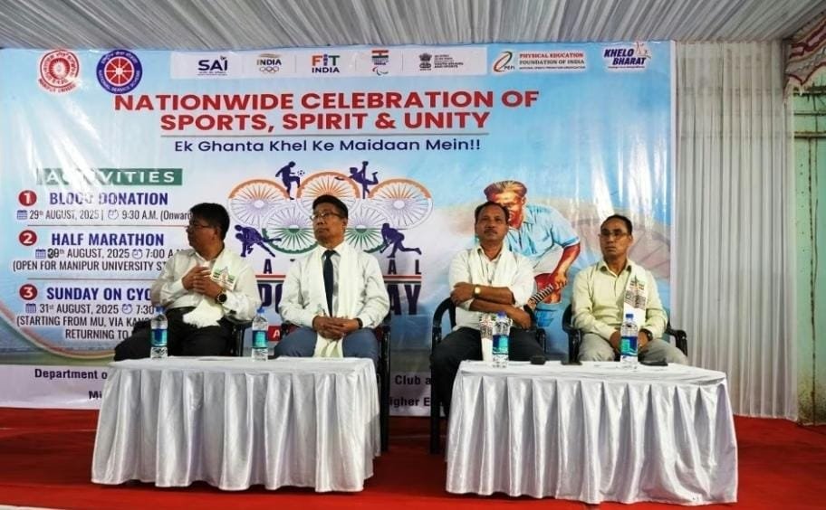 Manipur University today observed National Sports Day with a grand celebration of sportsmanship and unity, organized by the Department of Physical Education and Sports Science (PESS) in collaboration with the Fit India Campaign Committee, Fit India Club, and the National Service Scheme (NSS) Cell. The event, held at Dr. Kamal Indoor Stadium, Canchipur, was conducted under the national theme “Ek Ghanta Khel Ke Maidan Mein”, launched by the Government of India.