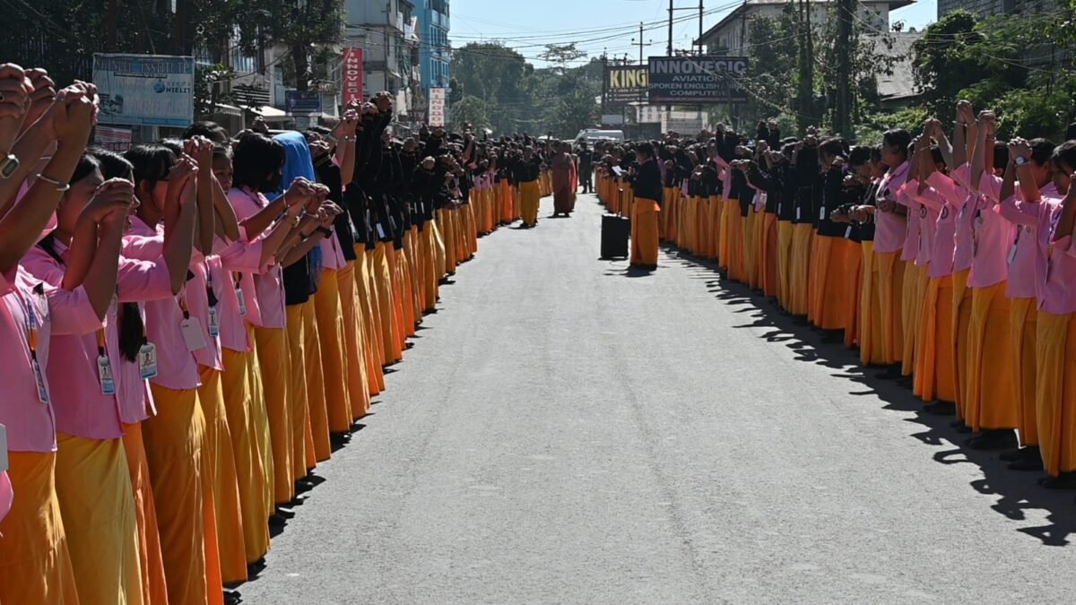 On Children’s Day, students across Manipur took to the streets in protest, demanding the immediate release of six individuals from Meitei community—three women and three children—reportedly abducted by militants in Jiribam. Holding banners and chanting “Release all six abducted by militants,” students called on the government for urgent action to secure the safe return of the abductees.