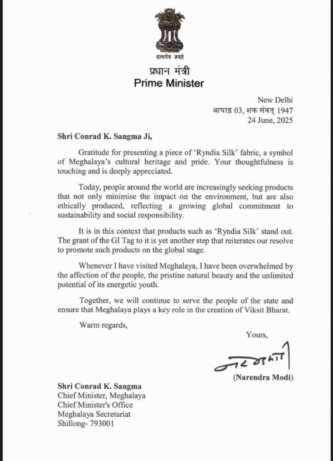 Chief Minister Conrad K. Sangma shared the letter on his official Facebook page on Wednesday, expressing gratitude for the recognition. He wrote, “Grateful to the Prime Minister for recognizing Ryndia — Meghalaya’s GI-tagged Eri silk, handwoven by Ri-Bhoi District’s women weavers. Thanks to designer KINIHO for reinterpreting our heritage with care and creativity.”