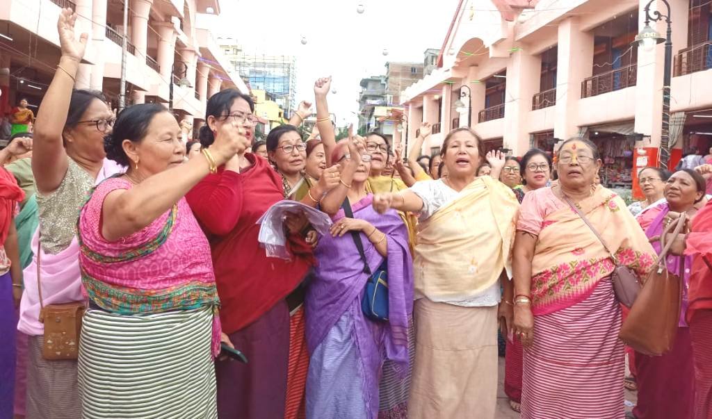 Women from Khwairambandh Keithel took to the streets today, expressing their anger and frustration towards both the central and state governments. The protest comes in the wake of a deadly drone attack by Kuki militants on Meitei villages, which resulted in the death of a 35-year-old woman and injuries to her daughter and several others. The incident has sparked outrage across the state.