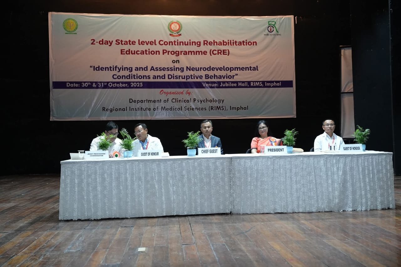 The Department of Clinical Psychology, Regional Institute of Medical Sciences (RIMS), Imphal, organized a two-day State Level Continuing Rehabilitation Education (CRE) Programme on the theme “Identifying and Assessing Neurodevelopmental Conditions and Disruptive Behaviour” at Jubilee Hall, RIMS, Imphal.
