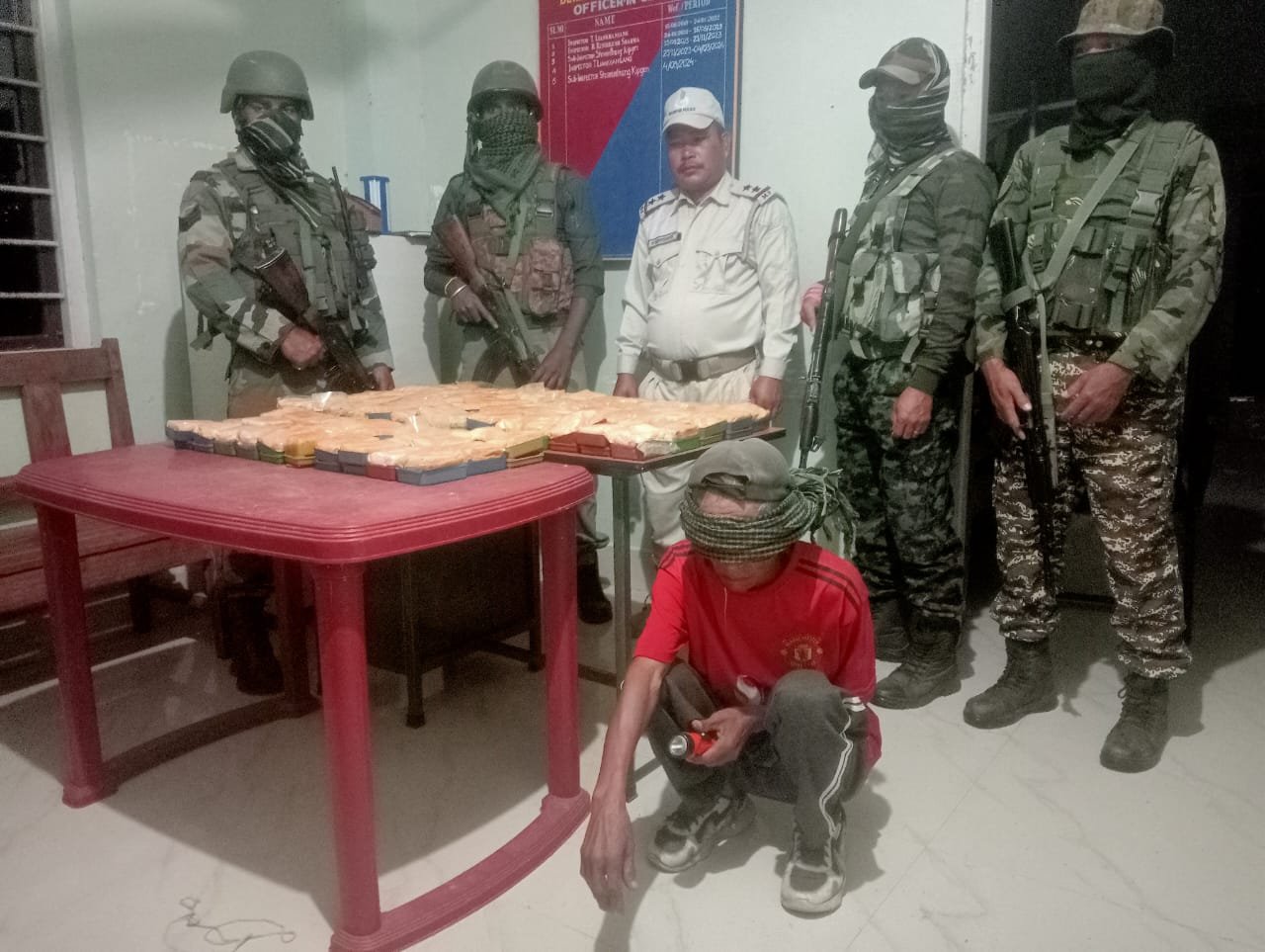 In the first operation, a team apprehended Zamkhampau (67) of Bualkot village, Churachandpur district, from a forest area near his village under Behiang Police Station. The security forces seized 100 soap cases of heroin powder weighing approximately 1.2 kilograms from his possession.