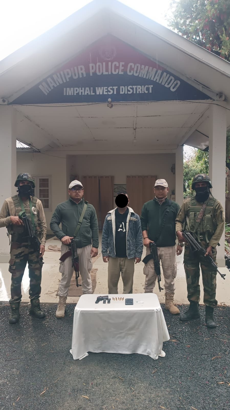 In another operation at Laipham Khunou Mayai Leikai under Lamphel Police Station in Imphal West district, forces arrested Sagolshem Boicha Singh (42), alias Tayai, of Sawombung Gate in Imphal East. A .32 pistol, two magazines, ten rounds of ammunition, a mobile phone and an Aadhaar card were recovered from his possession, indicating alleged involvement in illegal arms activities.