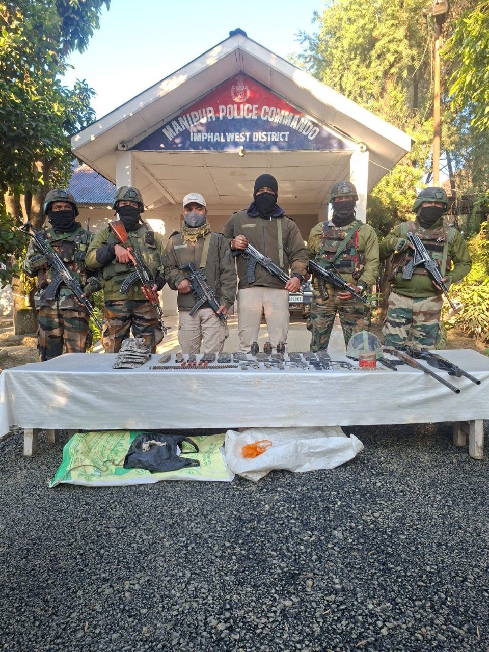 On December 7, security forces recovered a large cache of arms and explosives from the IVR of Tharoijam Awang Leikai under Patsoi Police Station in Imphal West district. The recovered items included two single-barrel guns, five pistols with a magazine, one air pistol, 11 magazines, five 12-bore cartridges, 45 rounds of AK ammunition, three high-explosive grenades, six detonators and camouflage gear.