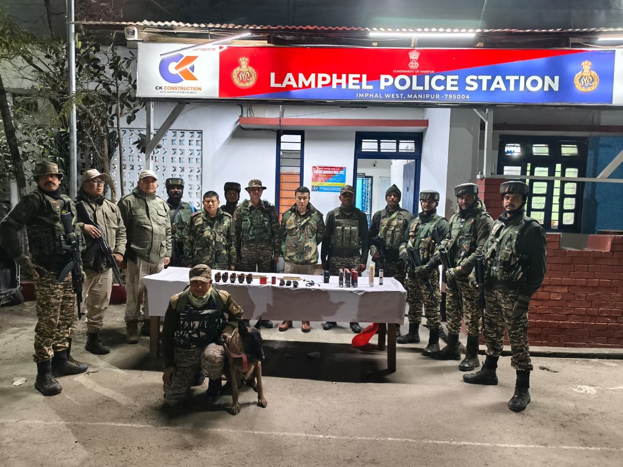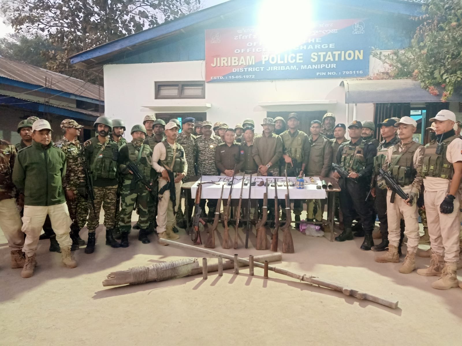 Another operation on the same day at Elangba Ching in the Wangoo area under Wangoo Police Station in Kakching district resulted in the recovery of a Ghatak assault rifle, two DBBLs, three single-barrel breech-loading guns, four high-explosive grenades, two magazines of different arms, four tube-launching devices, 35 live rounds of ammunition, 14 empty cases, eight tear smoke grenades, eight tear smoke shells, two Baofeng handsets with chargers, a bulletproof jacket without plate, an HYT mobile radio, two pairs of boots and three helmets.