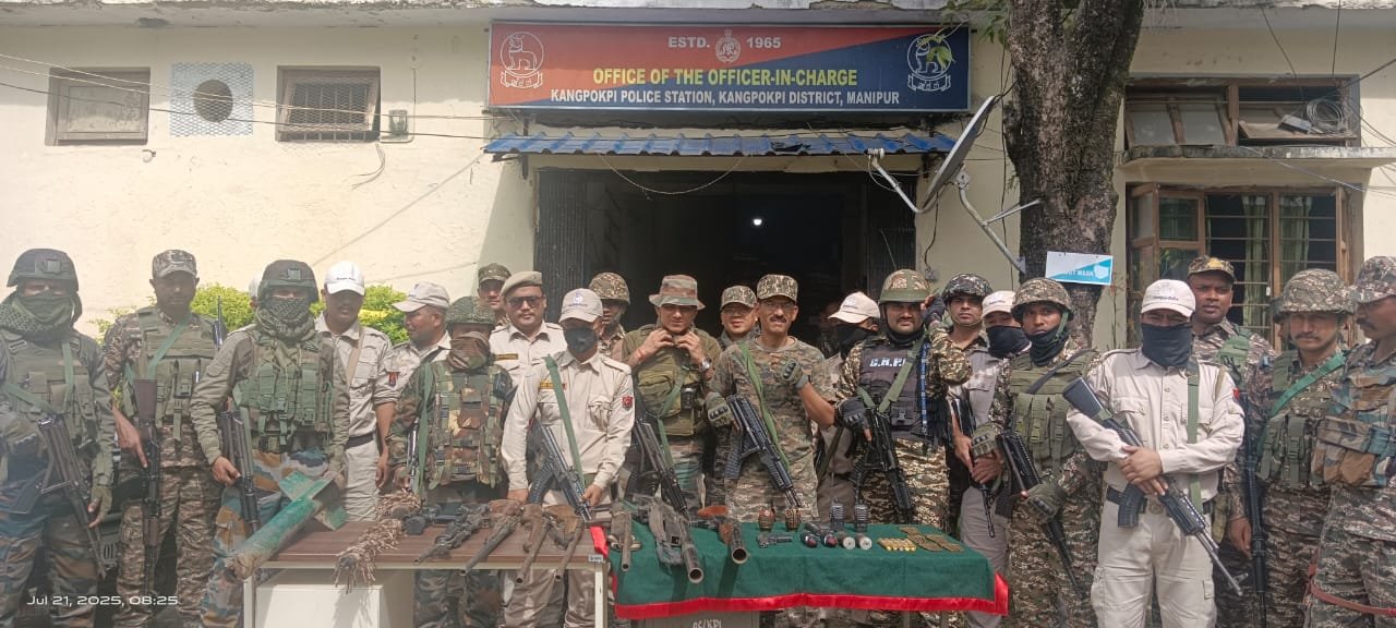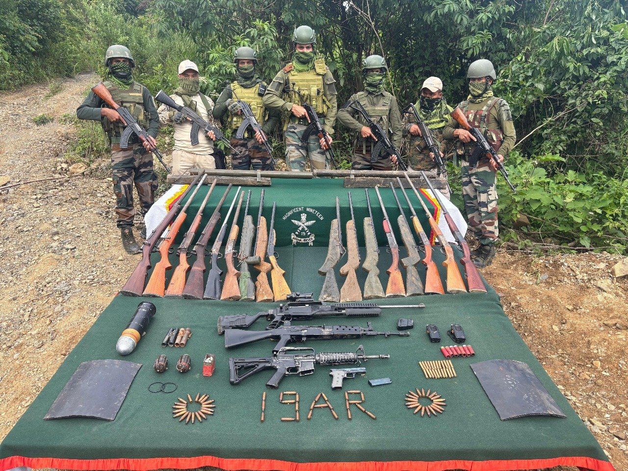 Meanwhile, in two separate search operations conducted on Monday in the general areas of Tingkai Khullen, Maohing, and Changoubung villages in Kangpokpi district, security forces recovered a significant cache of arms and ammunition.