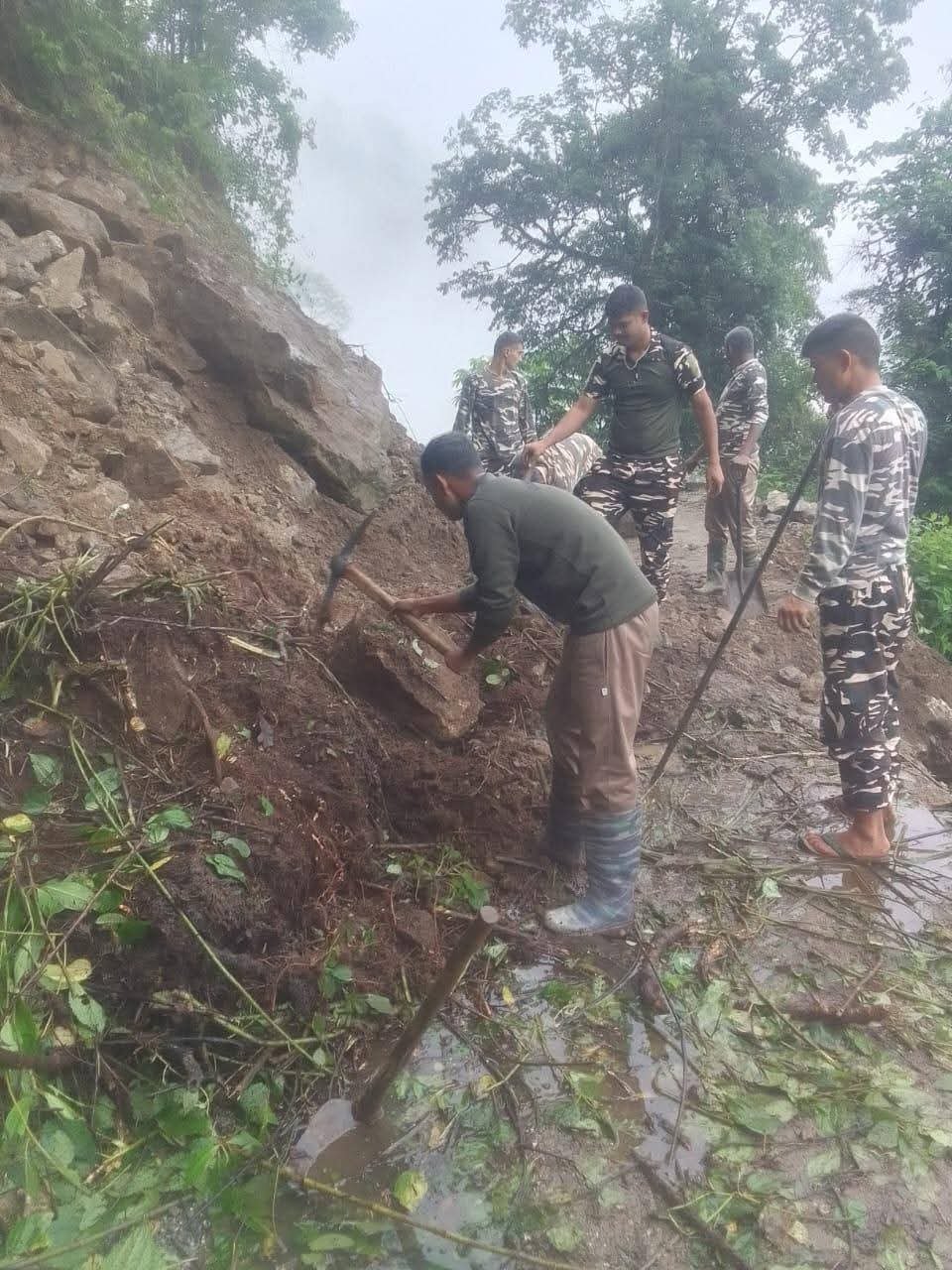 Under the leadership of the Battalion Commandant, SSB personnel deployed at Border Post Nambu acted swiftly. Braving difficult terrain, harsh weather, and rocky debris, they cleared the blocked road with dedication and resilience.