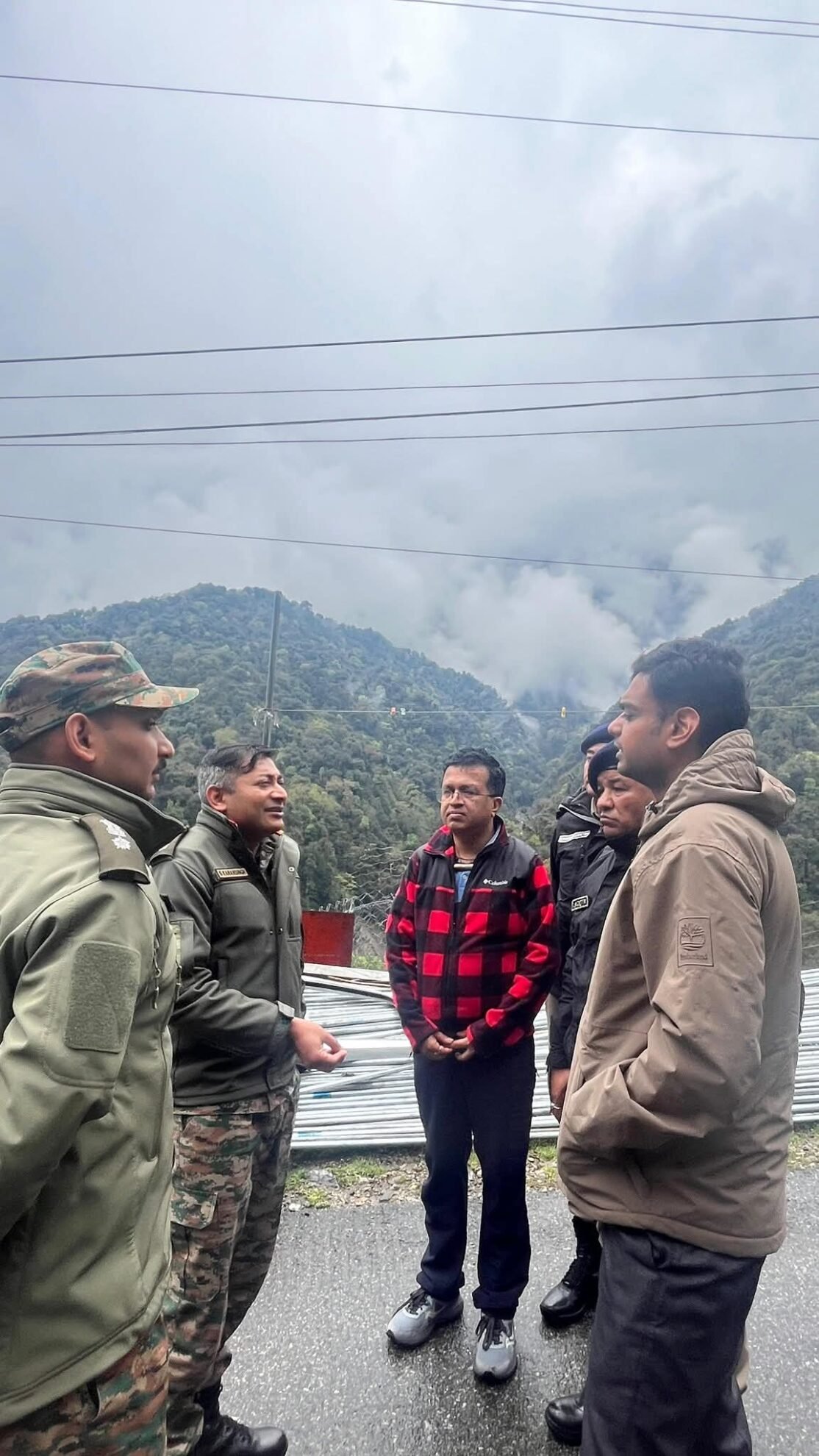 The inspection team included Anant Jain, District Collector of Mangan; L. B. Chettri, Superintendent of Police; Arun Chettri, SDM Chungthang; Chandan Chhetri, SDPO Chungthang; along with the SHO of Chungthang and AE, BAC.