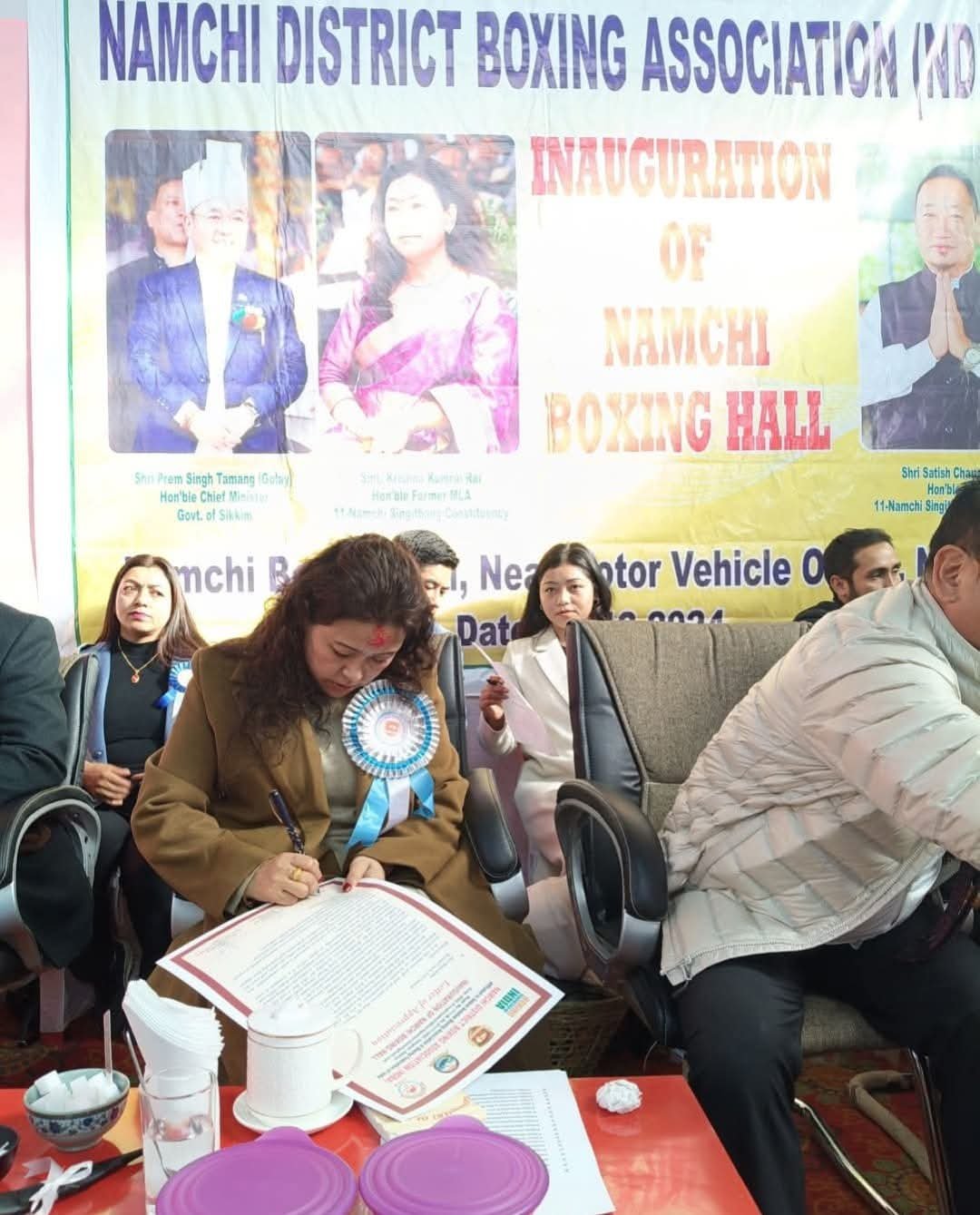 Namchi, Dec 16: The newly constructed Namchi Boxing Hall at the Namchi Parking Plaza was officially inaugurated on December 15 by Krishna Kumari Rai, former Sikkim MLA and wife of the Chief Minister of Sikkim. The event saw the presence of key dignitaries, including Satish Chandra Rai, Area MLA, Ganesh Rai, Chairman of the Namchi Municipal Corporation (NMC), alongside members of the Namchi District Boxing Association (NDBA) and local residents.