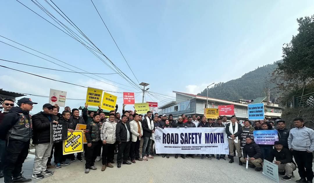 Mangan, Feb 5: National Road Safety Month was observed in Mangan with a series of awareness-raising activities organized by the Motor Vehicle Division under the Transport Department at Ringhim Helipad on Wednesday. The event aimed to highlight the importance of road safety, responsible driving, and compliance with traffic regulations to prevent accidents and ensure safer roads.